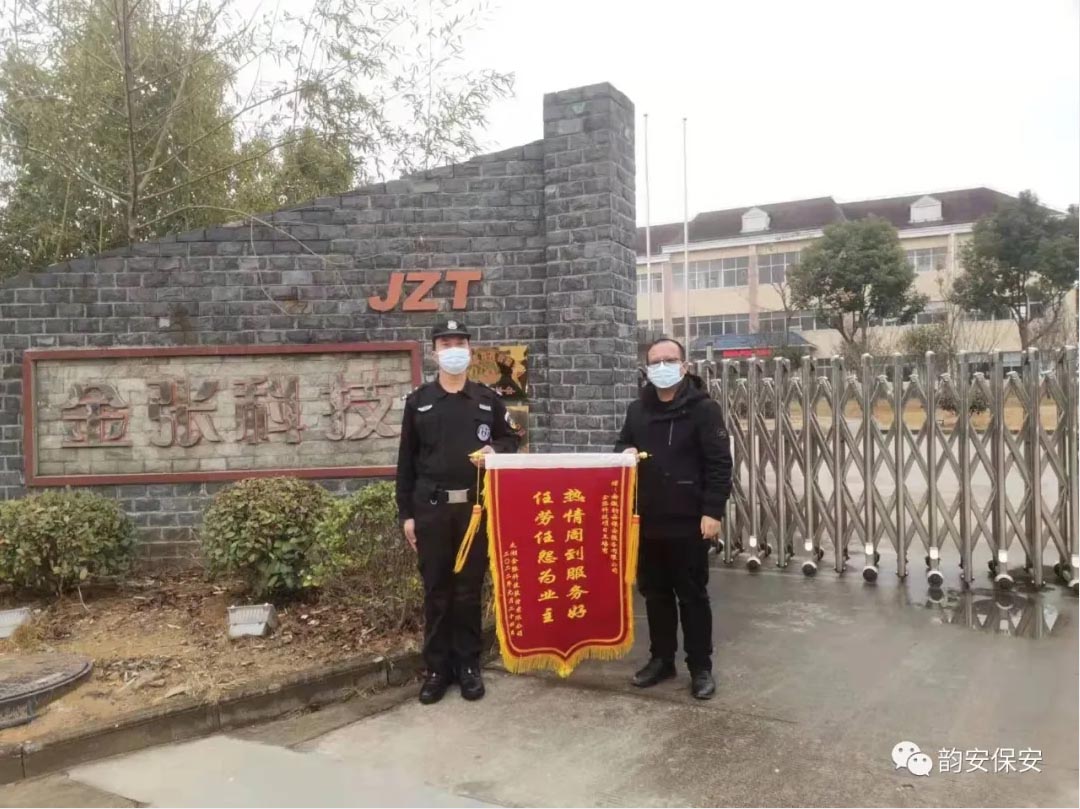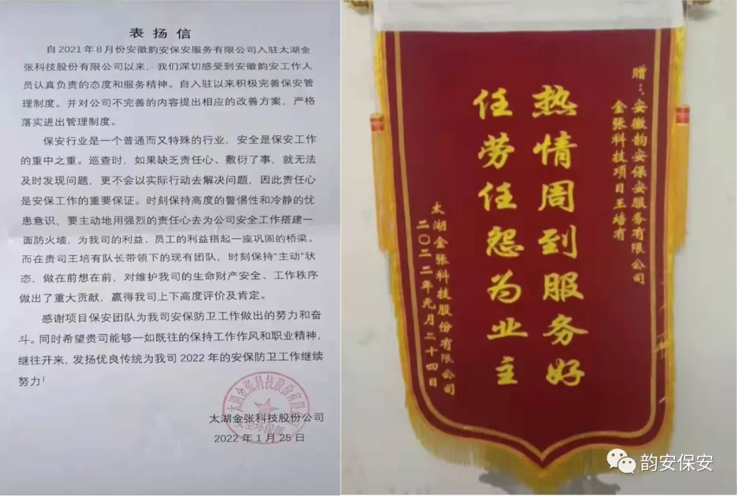 安徽韻安保安服務(wù)有限公司自承接太湖金張科技股份有限公司安保項目以來,公司領(lǐng)導高度重視,深入現(xiàn)場,組織人力,認真負責做好各項安保服務(wù)工作,及時有效地完成各項任務(wù)。為此,時值小年,客戶先后送來表揚信與錦旗,對韻安公司做好安保服務(wù)項目各項工作給予高度肯定與贊揚。